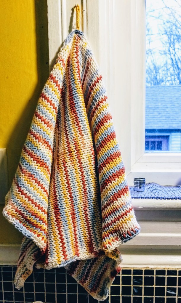 Fold dishcloth in half and attach the 14 st chain forming a loop to hang.